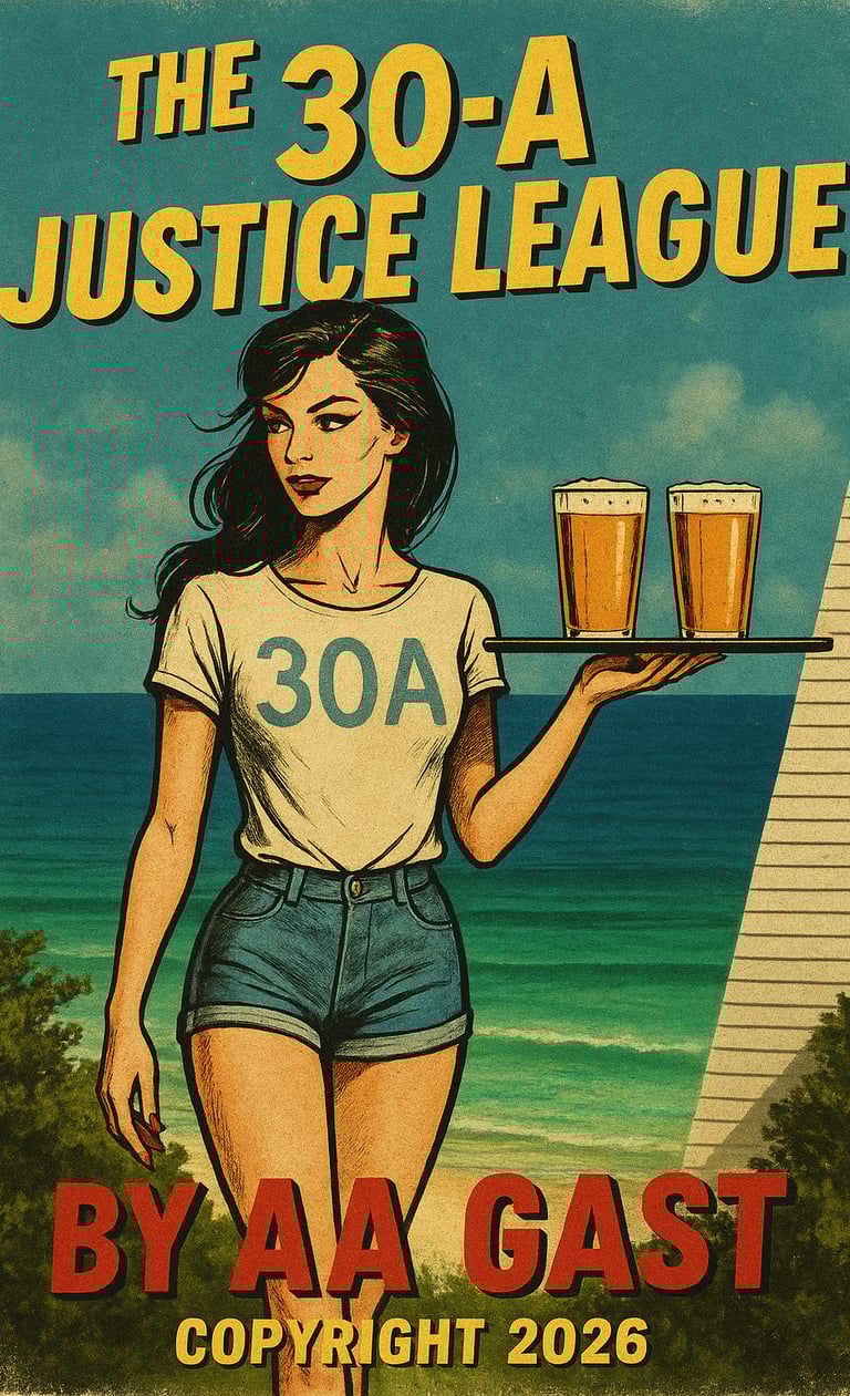 A.A. Gast's The 30-A Justice League is a warm, wise, frequently hilarious blend of coastal noir, midlife reckoning, and metaphysical comedy—something like Elmore Leonard vacationing in Florida Man territory, only to be narrated by a sardonic guardian angel with opinions on everything from boats to bourbon.